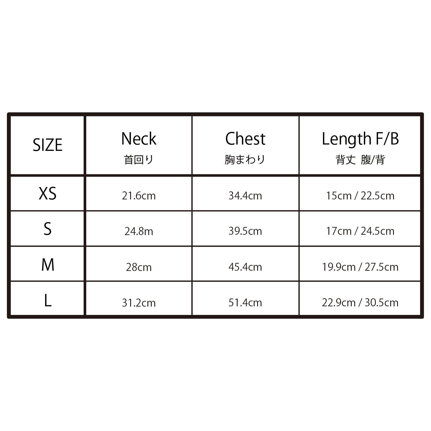 XS:首回り 21.6cm 胸回り 34.4cm 背丈 腹/背 15cm/22.5cm